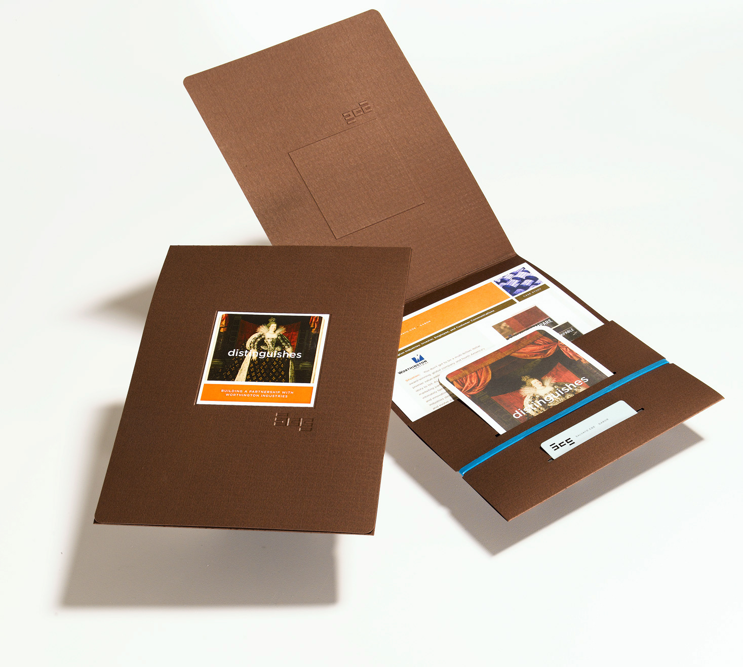 A proposal housing unit for a graphic design firm’s case study and introductory material providing an inexpensive, flexible approach that can be customized for each client with the individual cover labels inkjet printed in-house